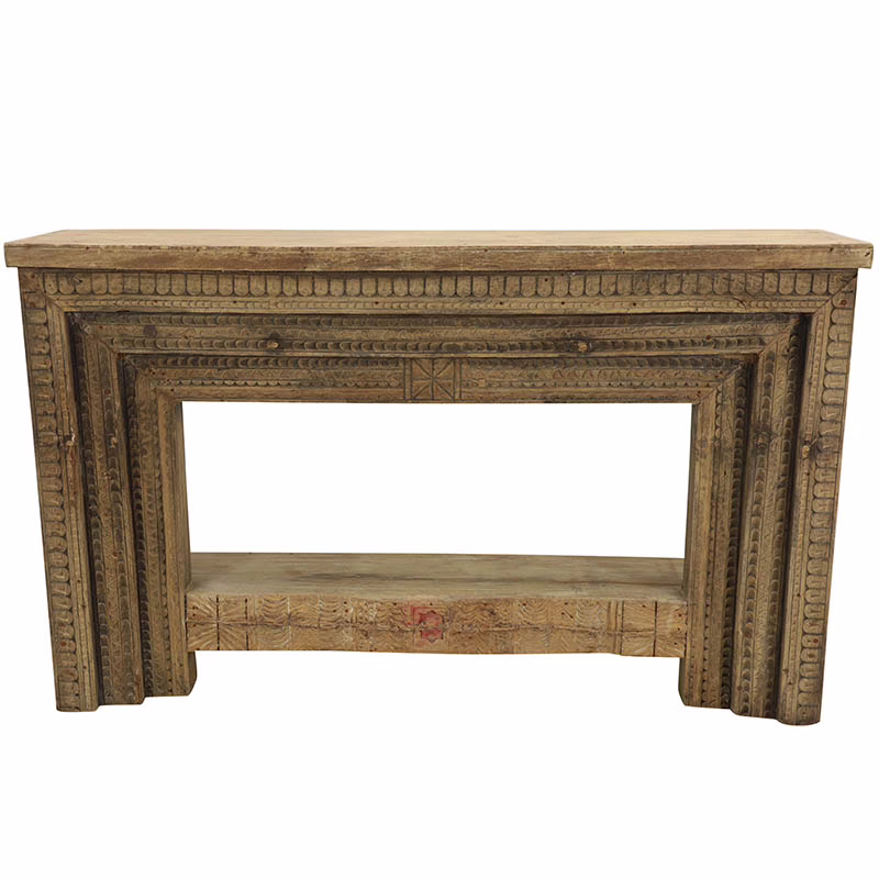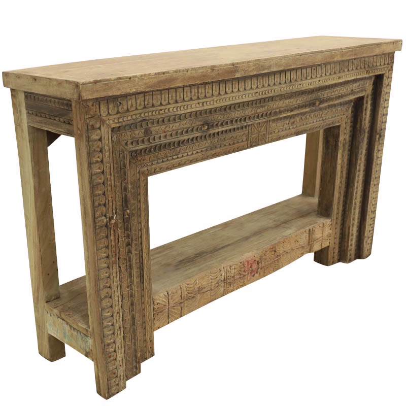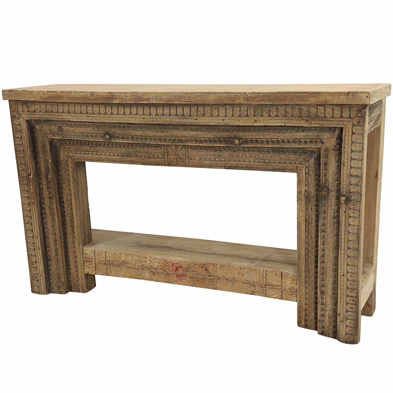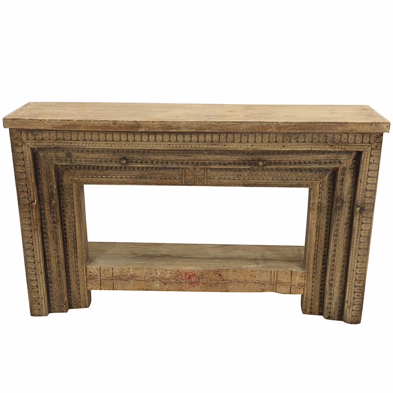 The Caliste antique doorframe console table features deeply carved detailing along the apron and legs, echoing the layered depth of antique architectural elements. The warm, weathered wood finish highlights the carving without overpowering the space, making it equally suited for rustic, transitional, and organic modern interiors. A full length lower shelf adds functional storage while maintaining an open, balanced silhouette.
