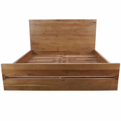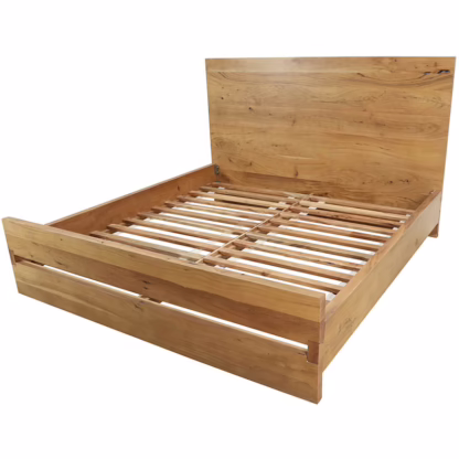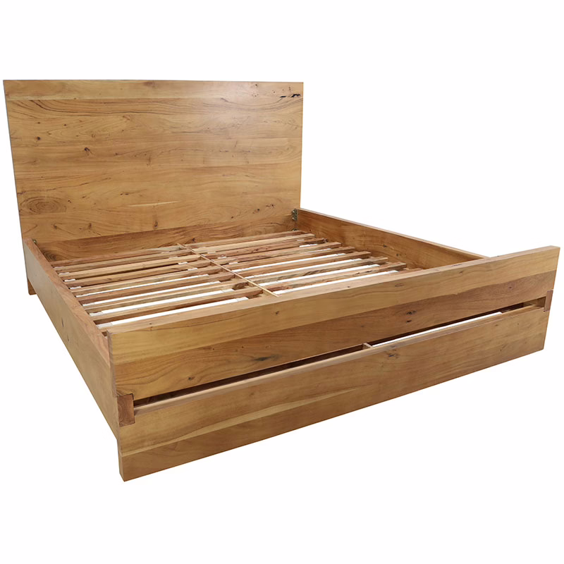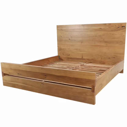 The Calgary King Bed manifests the unscripted artistry of solid wood. Featuring a formidable solid wood frame, this bed embraces essential design, conveying uncompromised quality and timeless form. The Calgary’s warm brown finish amplifies the wood’s natural grain, each fiber appearing eternally bathed in golden light. With its sleek, low-profile frame, the Calgary perfects a sanctuary of undisturbed repose.