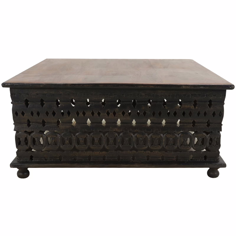 Each side of the Eshma coffee table features intricate hand carved geometric patterns, creating a sculptural presence that feels grounded yet refined. The solid teak top provides a smooth, expansive surface for styling, entertaining, or everyday use, while the carved base adds visual interest from every angle. Natural variations in the wood grain, tone, and carving depth ensure that no two pieces are ever exactly alike.