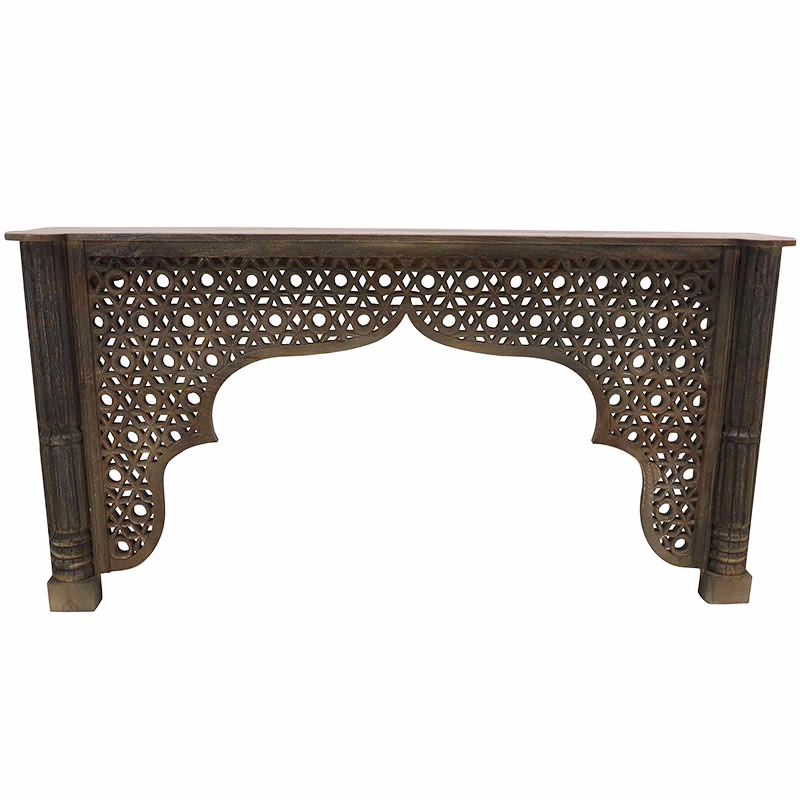 The defining feature of the Darana is its intricate carved apron, showcasing repeating geometric motifs framed by softly curved arches. Each cut is done by hand, creating subtle variations that make every console table truly one of a kind. The solid teak top offers a warm, naturally aged finish that highlights the wood grain while providing a durable surface for everyday styling.