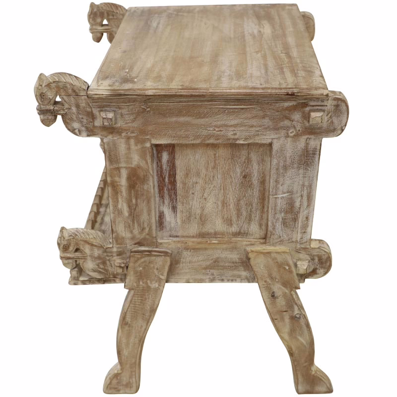 This authentic hand carved teak wood accent cabinet brings timeless craftsmanship and organic texture into your home. Made from solid wood and detailed with intricate hand carving, this piece delivers a naturally aged finish that highlights the character and variation found only in artisan-made furniture. The carved front panel and sturdy legs give it a grounded, heirloom feel that works beautifully in both rustic and transitional interiors.