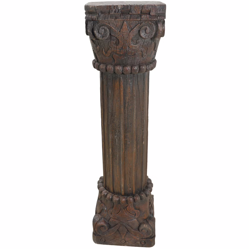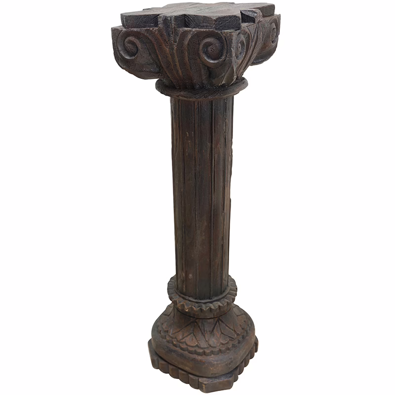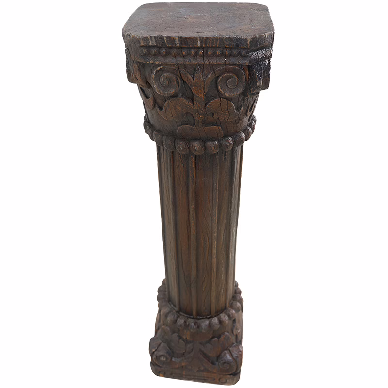 This antique wooden pillar is crafted from an authentic architectural column element, offering rich character and timeless presence for refined interiors. Hand carved detailing highlights traditional motifs shaped by age and craftsmanship, making each pedestal a distinctive statement piece. The aged teak wood finish showcases natural texture, patina, and depth that cannot be replicated, ideal for displaying sculpture, plants, or decorative objects.