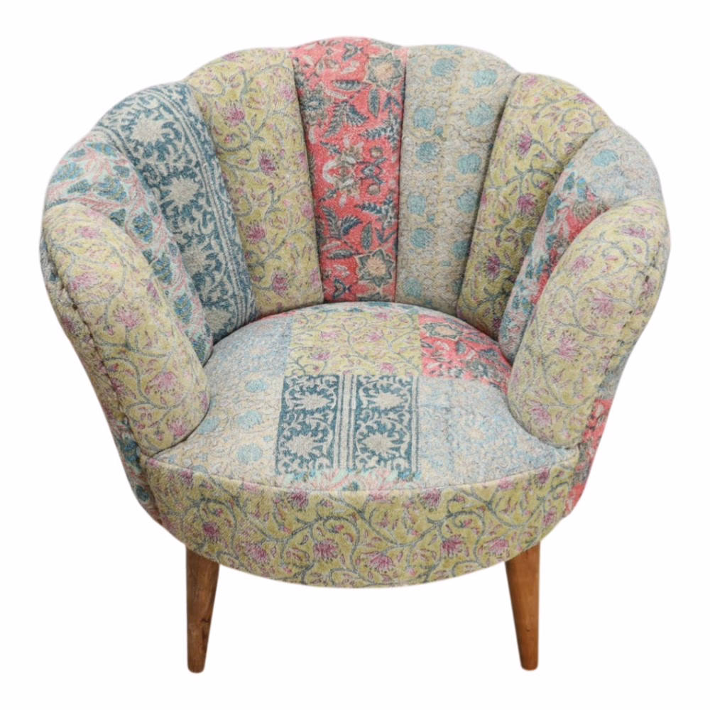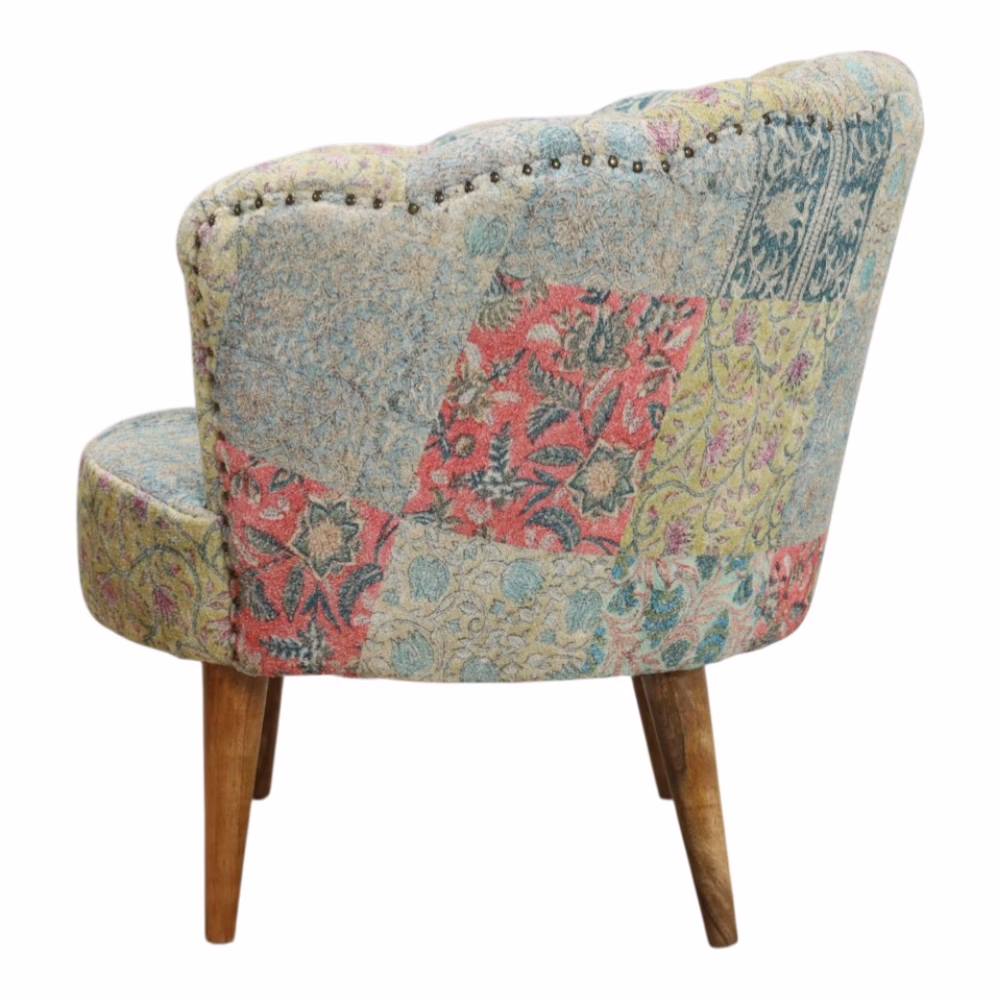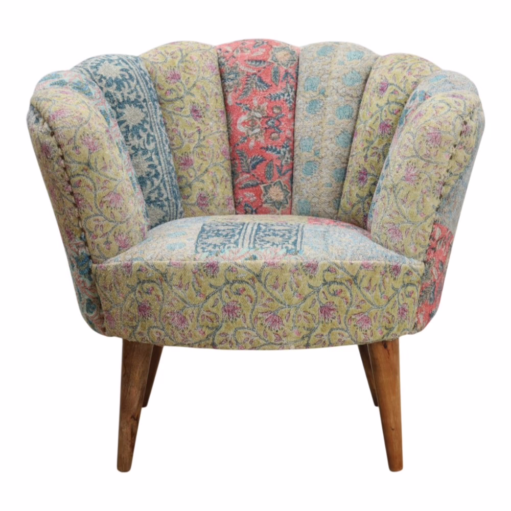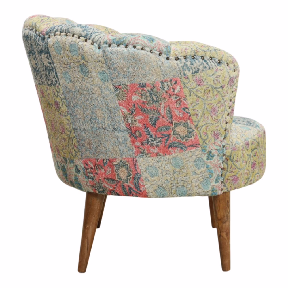 This accent chair works across living rooms, bedrooms, offices, and reading nooks. Its curved silhouette softens structured interiors, while the patchwork upholstery adds warmth and dimension. It pairs naturally with neutral sofas, wood tones, and layered textiles, allowing it to stand out without overwhelming the space.