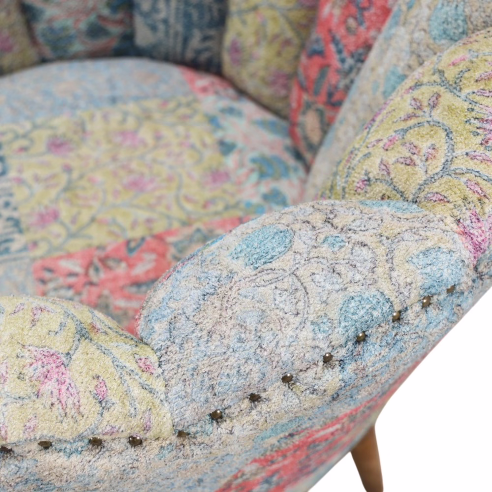 The upholstery is what sets it apart. A carefully composed patchwork of floral, medallion, and textured patterns creates depth and visual movement while maintaining a cohesive palette of soft blues, muted greens, warm neutrals, and subtle coral tones. Rather than feeling loud, the mix reads as layered and intentional.