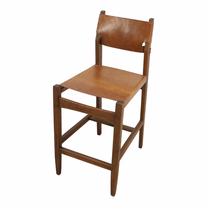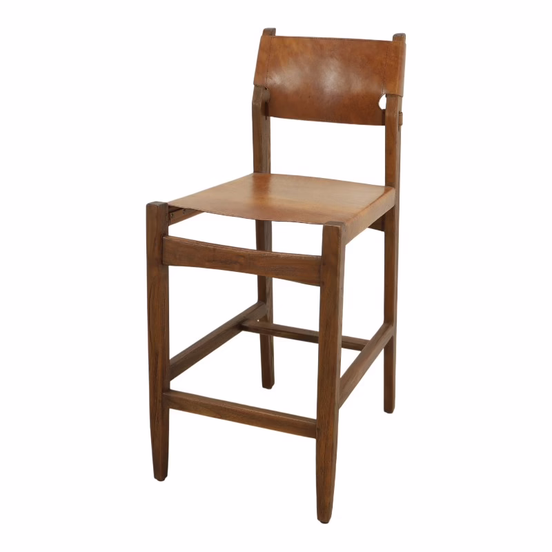 The Odell Leather Counter Stool is built on clarity—solid teak wood structure, tensioned leather seating, and a design that prioritizes material honesty over excess. Every element is purposeful, from the clean frame geometry to the strap-secured leather back.