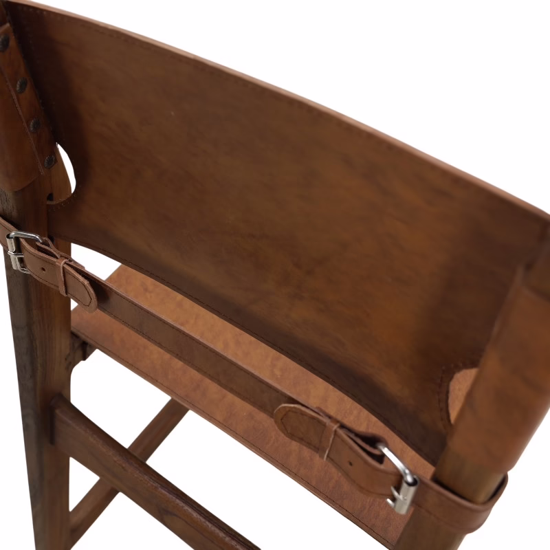 The leather seat is stretched rather than cushioned, creating a supportive surface that subtly adapts over time. The backrest follows the same philosophy, secured with a strap-and-buckle system that reinforces both structure and visual identity. This is not decorative hardware—it is functional, visible craftsmanship.