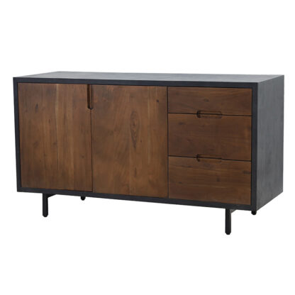 Entirely sensible and undeniably handsome, this modern sideboard offers adaptability to a multitude of décor styles. The Hodges is crafted from solid wood with a stark black frame and a warm umber body. Its lack of handles or pulls makes this sideboard sleek and straightforward; matching hardware is a non-issue with the Hodges. An ideal size for smaller dining areas, this piece features one large cabinet space and three different sized drawers. Enjoy infinite storage potential when you welcome the Hodges into your home.