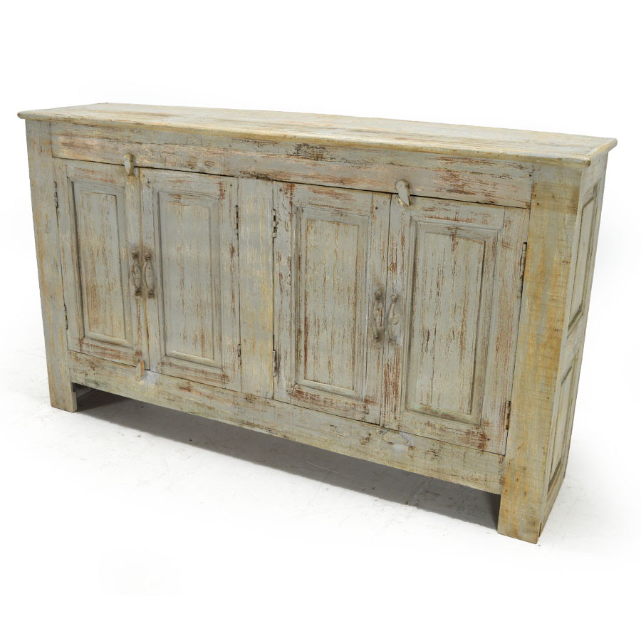 This one of a kind reclaimed wood sideboard is rich with texture and style due to the hand-rubbed grey wash finish. Refined antique wood doors provide generous storage serving as a beautiful multi-purpose media console or a dining buffet.